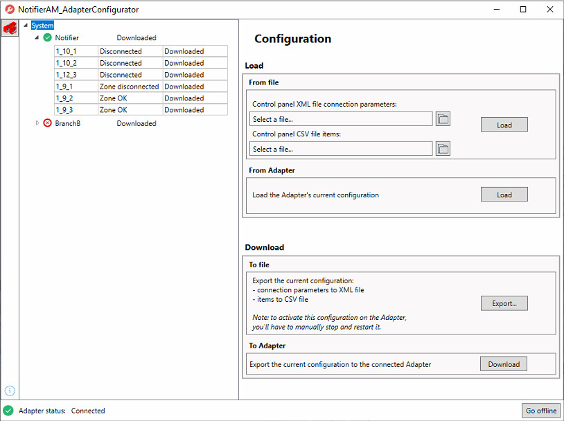 One CSV file per adapter is used. This file is automatically generated by the adapter. When the adapter starts up, the data of the items connected to the Notifier AM control panel is retrieved.