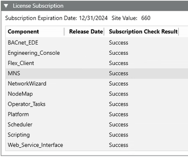 The License Subscription expander displays the Desigo CC license subscription expiration date, the site value (that is, the value of the site) and any details of the installed components.