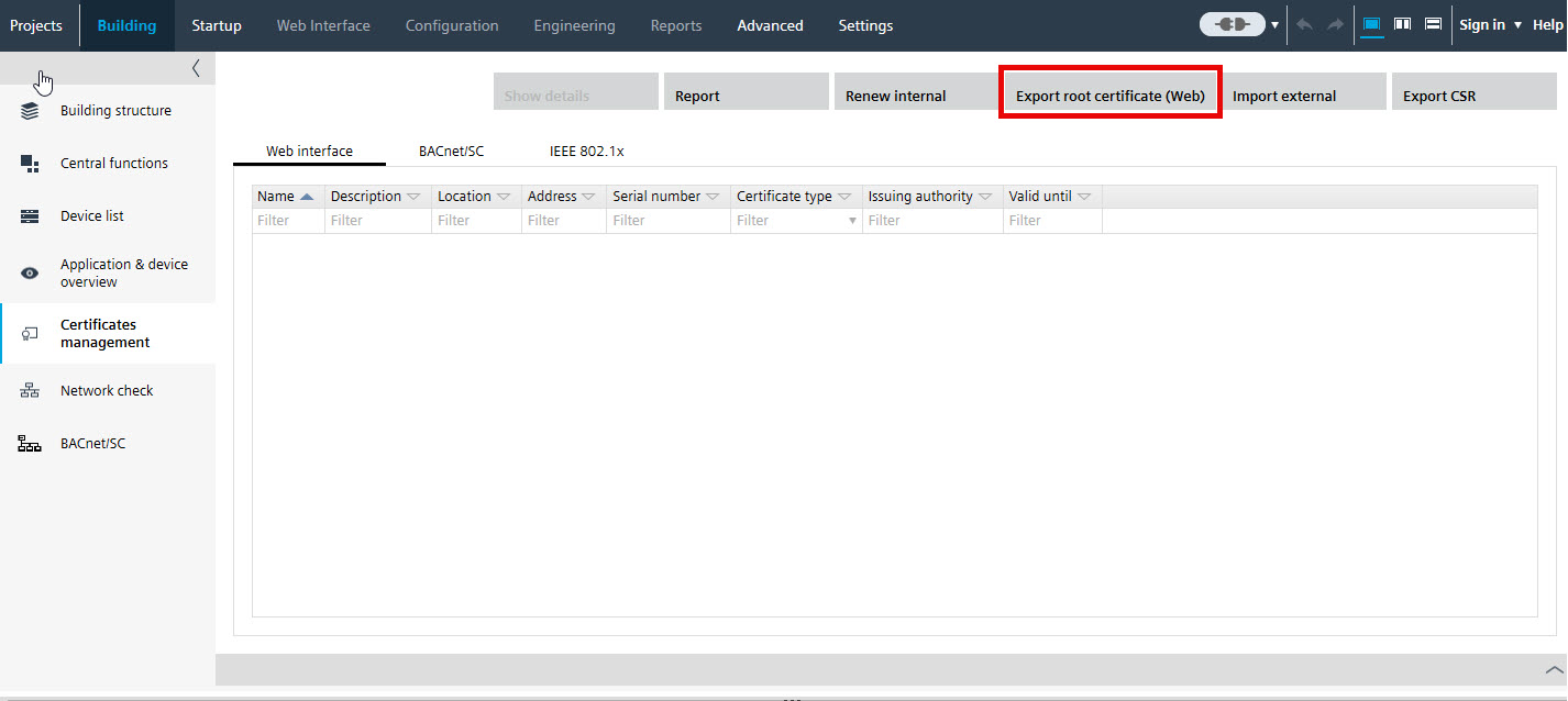 - To form a chain of trust, in ABT click Export root certificate to get a root certificate of the CA.