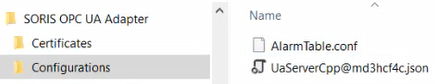- In C:\Program Files (x86)\Siemens\SORIS OPC UA Adapter the Configurations folder is created, which includes the AlarmTable.conf file and any other files that allow connecting to the OPC UA servers.