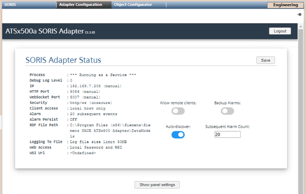 The SORIS Adapter Status tool page displays.