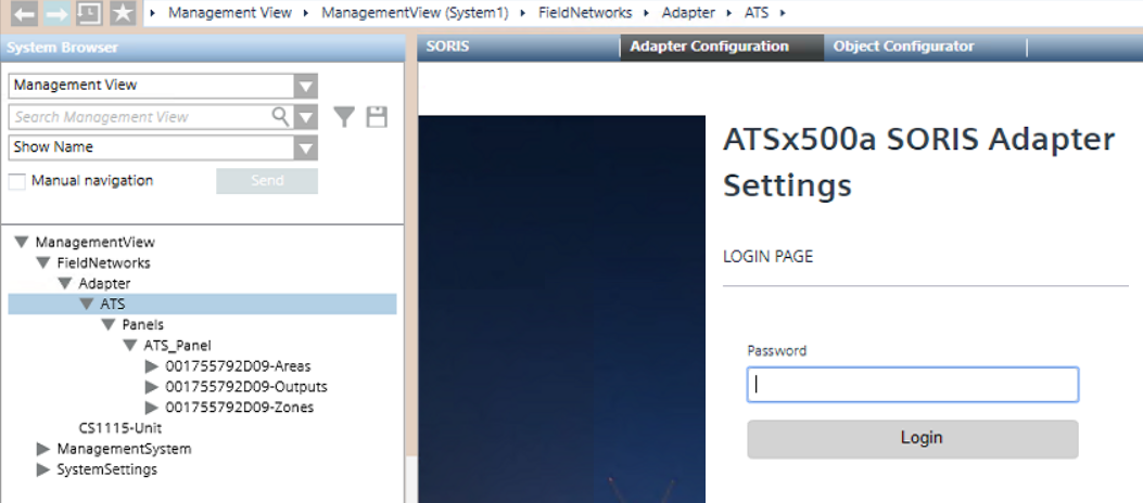 The login page of ATSx500a SORIS Settings displays.