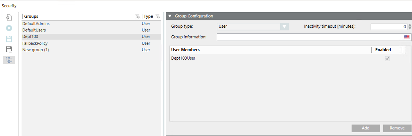 Drag one of the Desigo CC users from the Configured Users expander to the User Members list. For example, Dept100User.