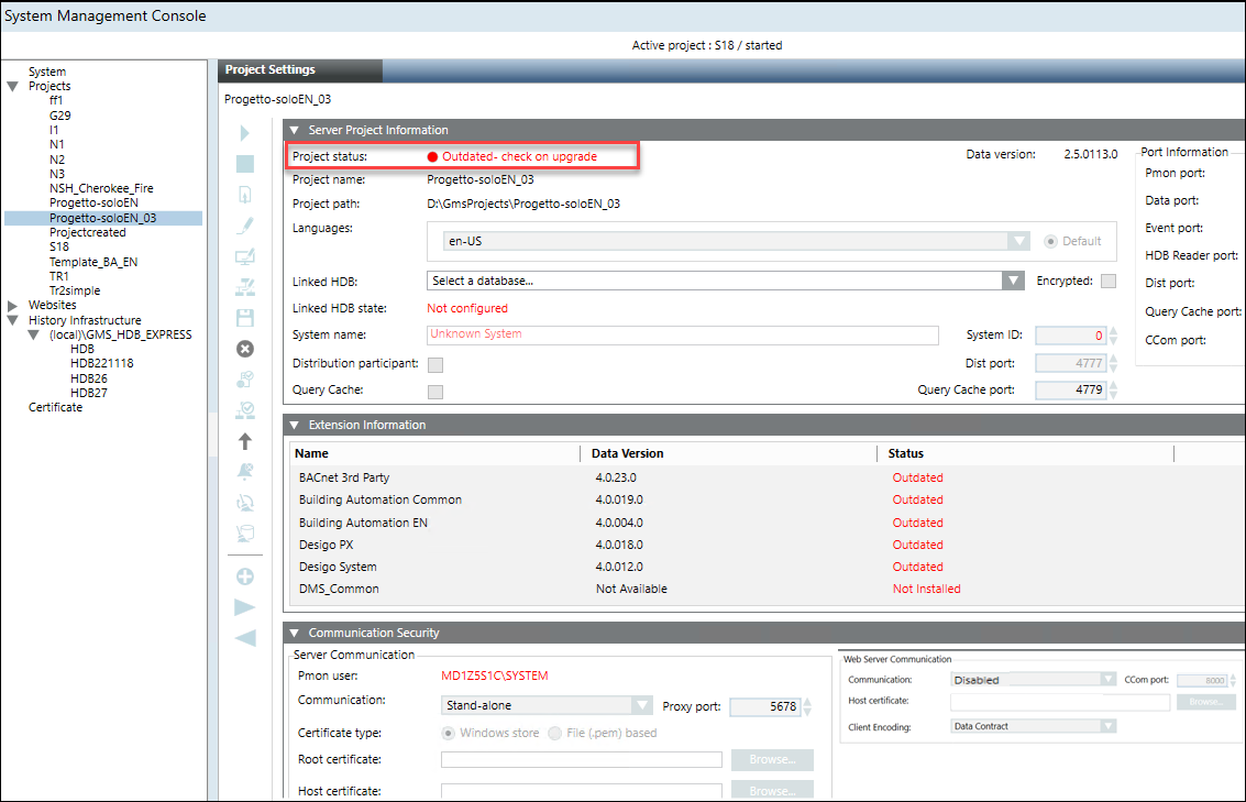- On confirmation, the project/project template is restored successfully, the project node displays under the SMC tree, the project folder is created at the specified project path, the Start, Stop, Activate, Edit, and Delete Project icons are available and the Upgrade icon is enabled only when the restored project version is older than the installed one.