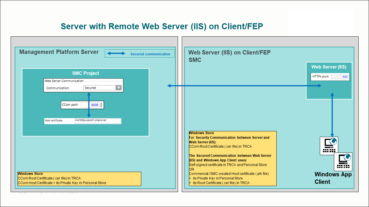 The web application user on this remote web server (IIS) must have access rights on the shared project folder on the Server. The communication between the web server (IIS) and Windows App client is always secured (using the web application certificate).