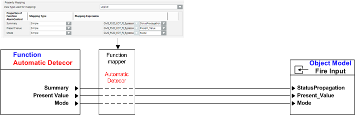 Simple Mapping has a 1:1 relation via the Function Mapper between Function and the Object Model. For example, this is an automatic fire detector (physical data point only) for a Function.