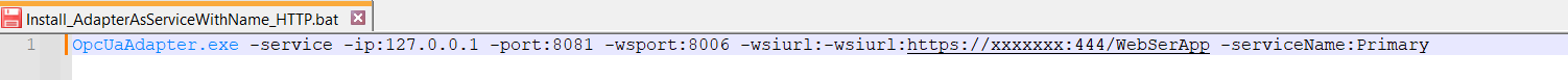 - In C:\Program Files (x86)\Siemens\OPC UA Adapter, open the file Install_AdapterAsServiceWithName_HTTP.bat with a text editor.