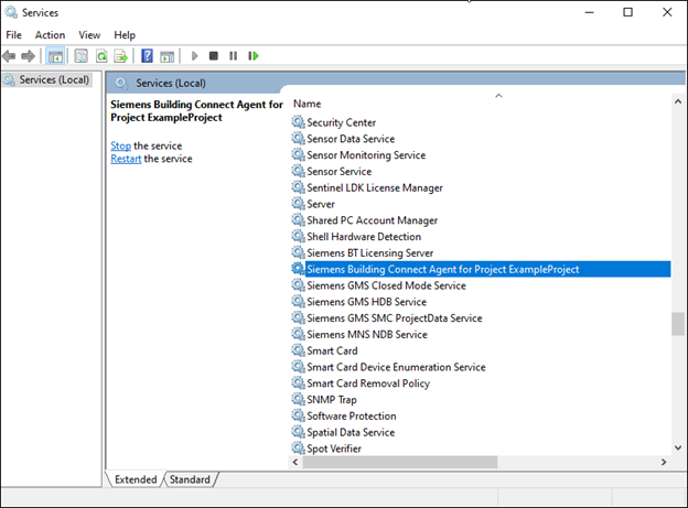 The Windows service that communicates with Building X is named Siemens Building Connect Agent for Project <Project Name>, where <Project Name> is the name of any project with a Building X Connector installed.
