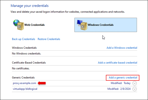 - The credentials for the proxy will need to be placed under Windows Credentials -> Add a Generic Credential: