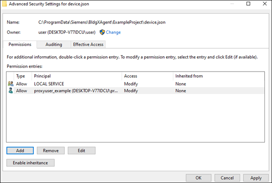 - Once you have selected the <proxyuser> account, you must assign permissions to the device.json file. Be sure that the Modify, Read & Execute, Read, and Write permissions are all selected. The permission type should be Allow.