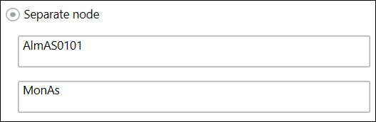 Select Separate node, if you want the object model and device instances to have different names. Drag-and-drop a dataset node from the System Browser that you want to set as the object model name to the first text field and the node to be set as the name of the device instance in the second text field. For example, if you add the nodes, AlmAS0101 to the first text field and MonAs to the second text field, then the Object Model will be created with the name AlmAS0101 and the device instance will be created with MonAs as the name.